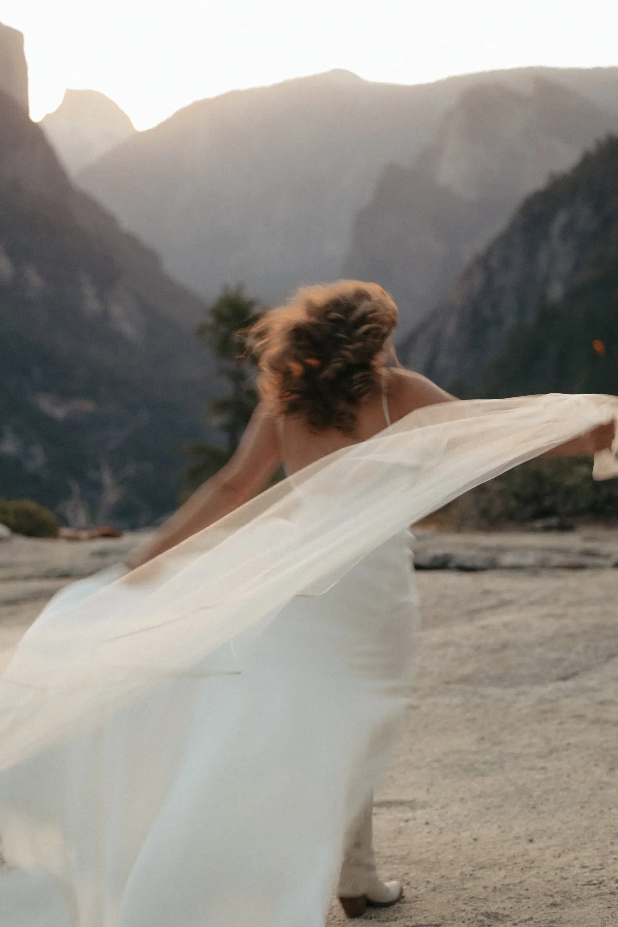 Tunnel View at Dawn. The way the dawn light shows up as firelight in this bride’s hair…